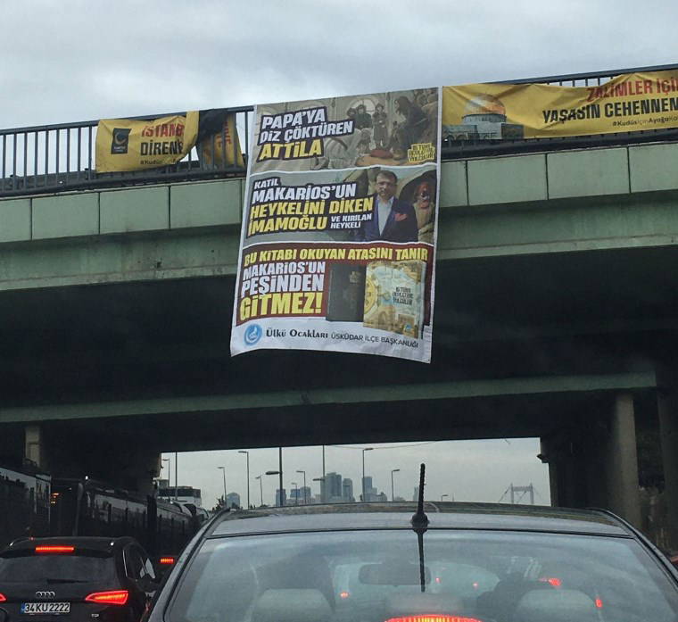 Sözkonusu afişte İBB Başkanı için "Katil Makarios'un heykelini diken İmamoğlu" ve "16 Türk Devletine Yolculuk" isimli Ülkü Ocakları tarafından yayımlanmış kitabın resmiyle birlikte "Bu kitabı okuyan Makarios'un peşinden gitmez" ifadeleri yer alıyor.