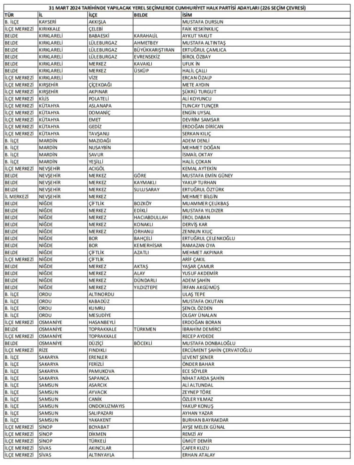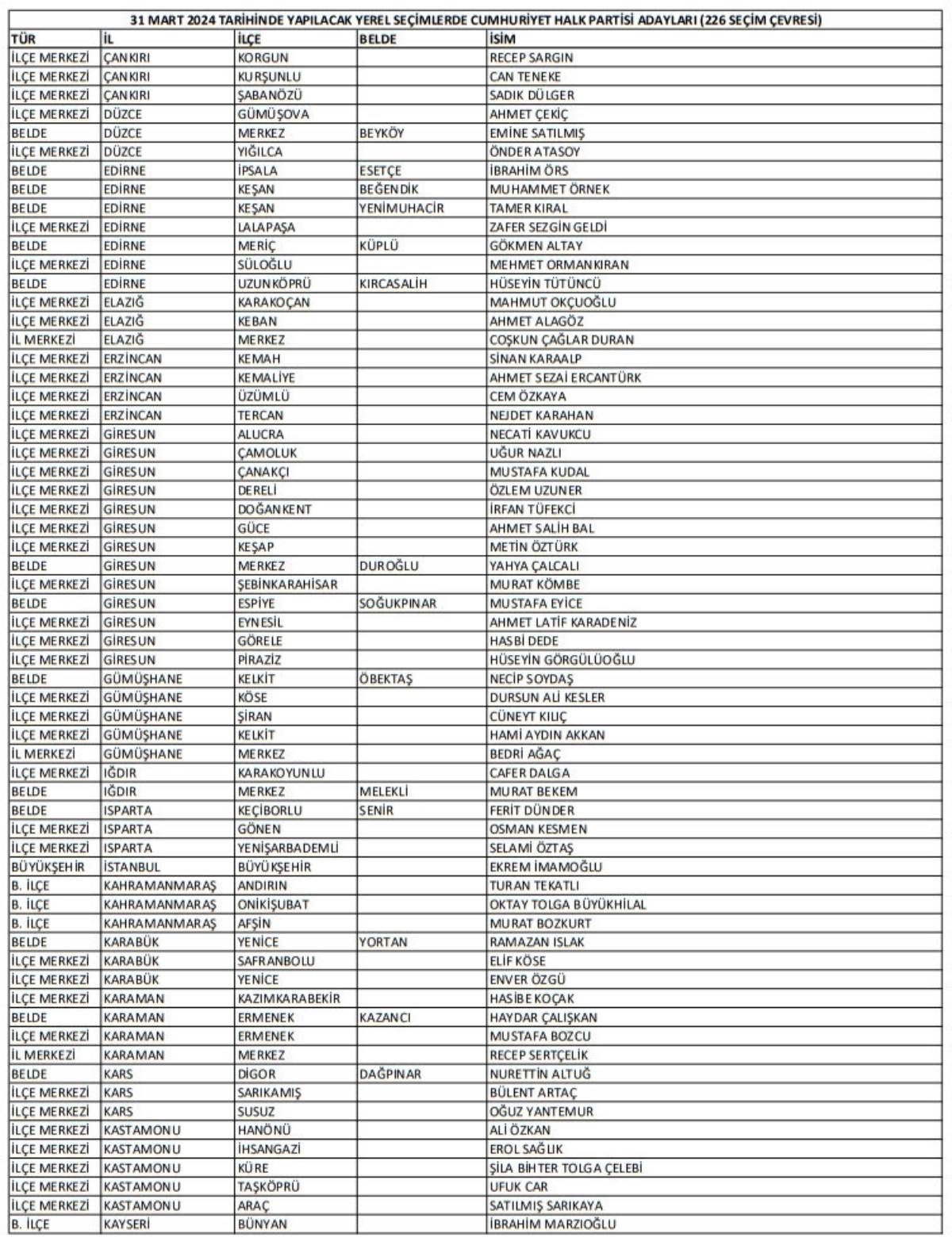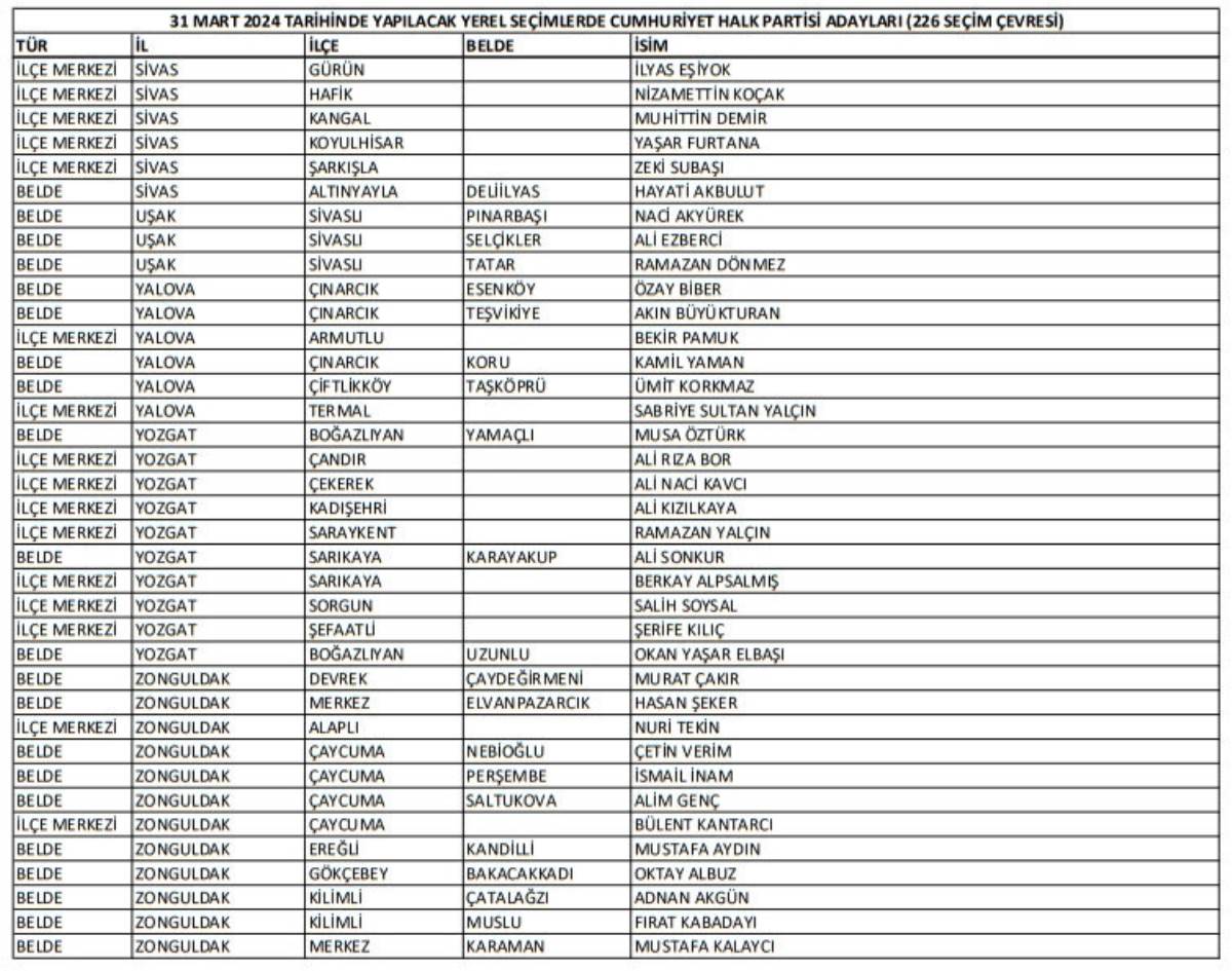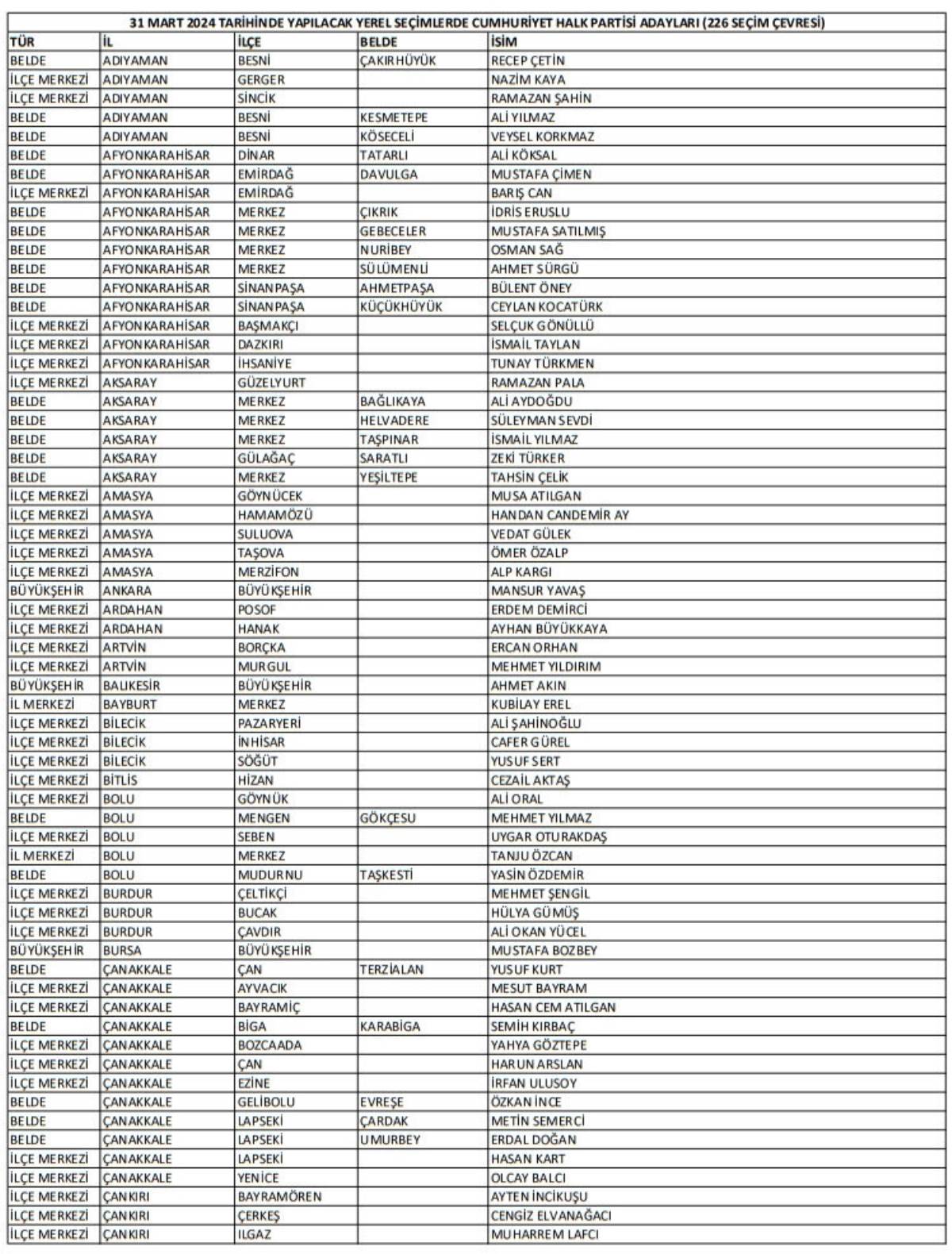 226 seçim bölgesindeki adayların tam listesi şöyle: