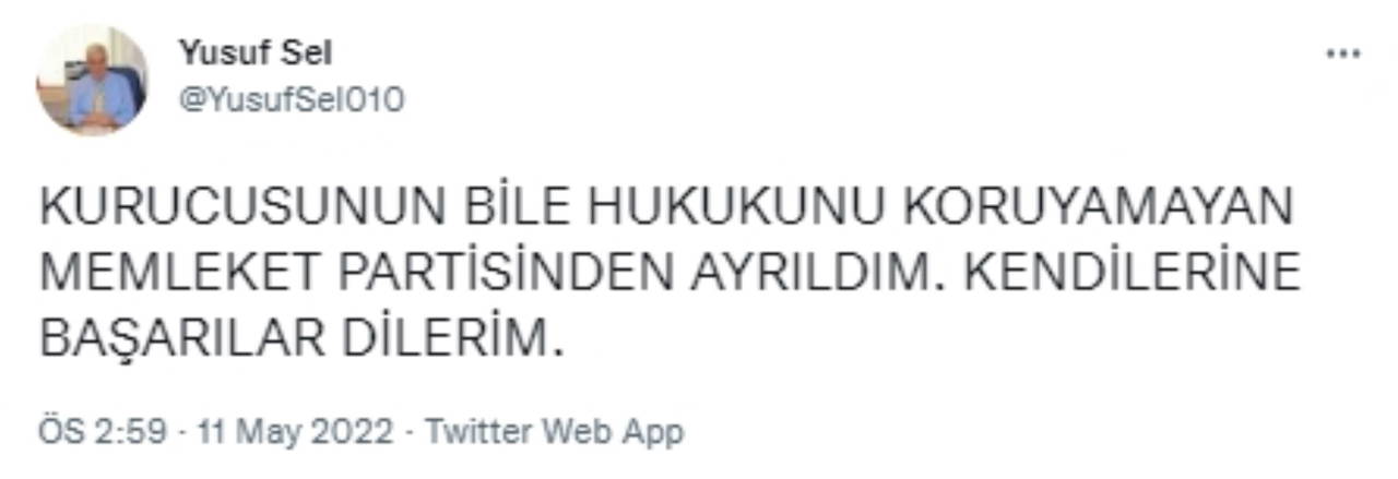 Sel, istifasına dair Twitter hesabı üzerinden yaptığı kısa açıklamasında "Kurucusunun bile hukukunu koruyamayan Memleket Partisi'nden ayrıldım. Kendilerine başarılar dilerim" ifadelerini kullandı.