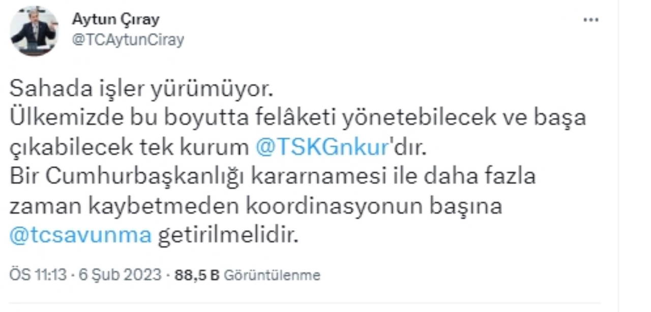 "Ülkemizde bu boyutta felâketi yönetebilecek ve başa çıkabilecek tek kurum Türk Silahlı Kuvvetleri'dir. Bir Cumhurbaşkanlığı kararnamesi ile daha fazla zaman kaybetmeden koordinasyonun başına Milli Savunma Bakanlığı getirilmelidir."