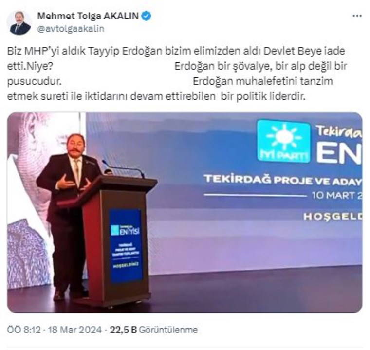İYİ Göç Politikalarından Sorumlu Genel Başkan Yardımcısı Mehmet Tolga Akalın, Tekirdağ'da partisinin 10 Mart'taki lansman programında yaptığı konuşmadan dikkat çeken bir kesiti sosyal medya hesabından paylaştı.