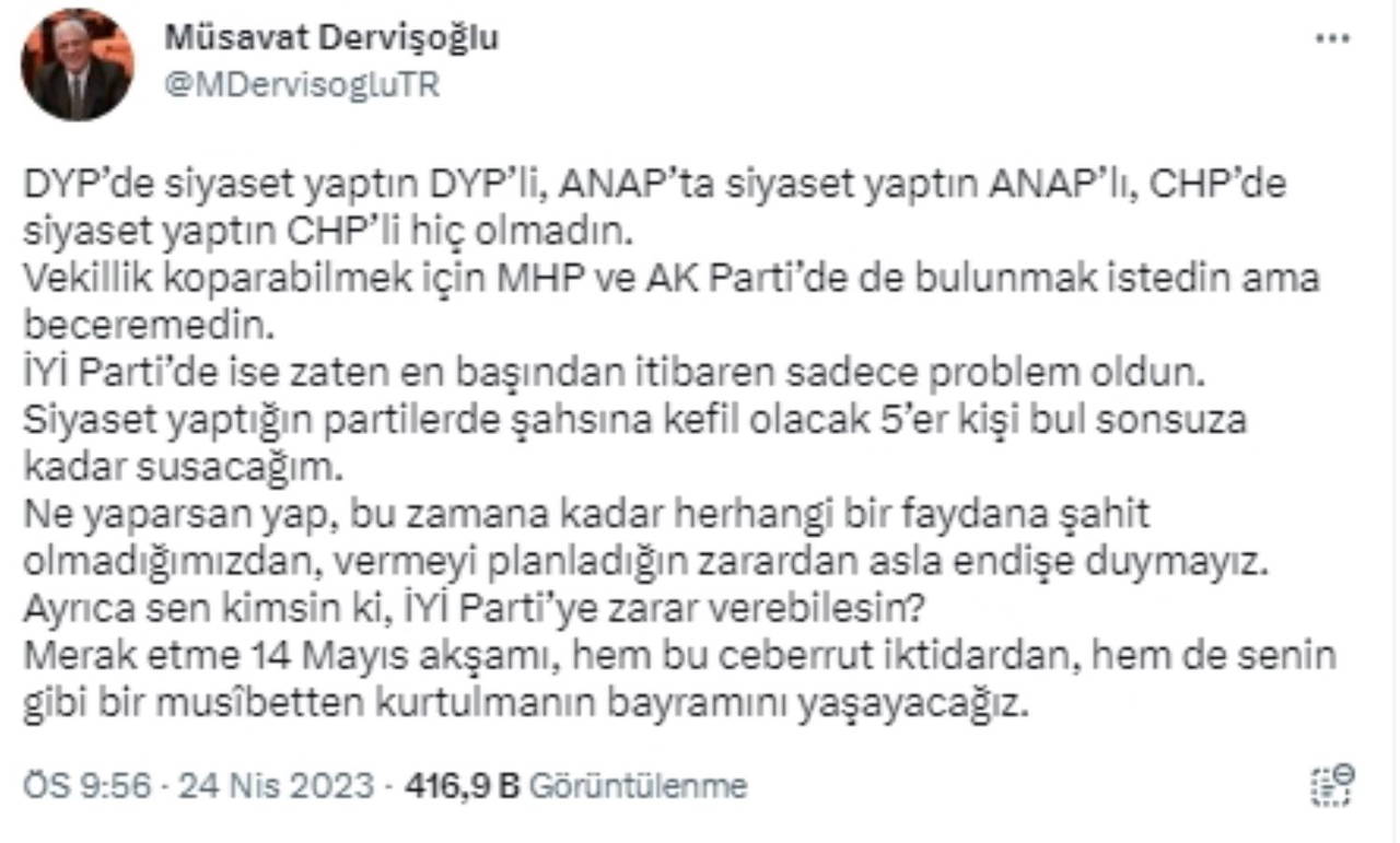 İYİ Parti TBMM Grup Başkanvekili Müsavat Dervişoğlu, sosyal medya hesabından isim vermeden, Genel Başkan Başdanışmanı ve İzmir milletvekili Aytun Çıray’ı hedef aldı.