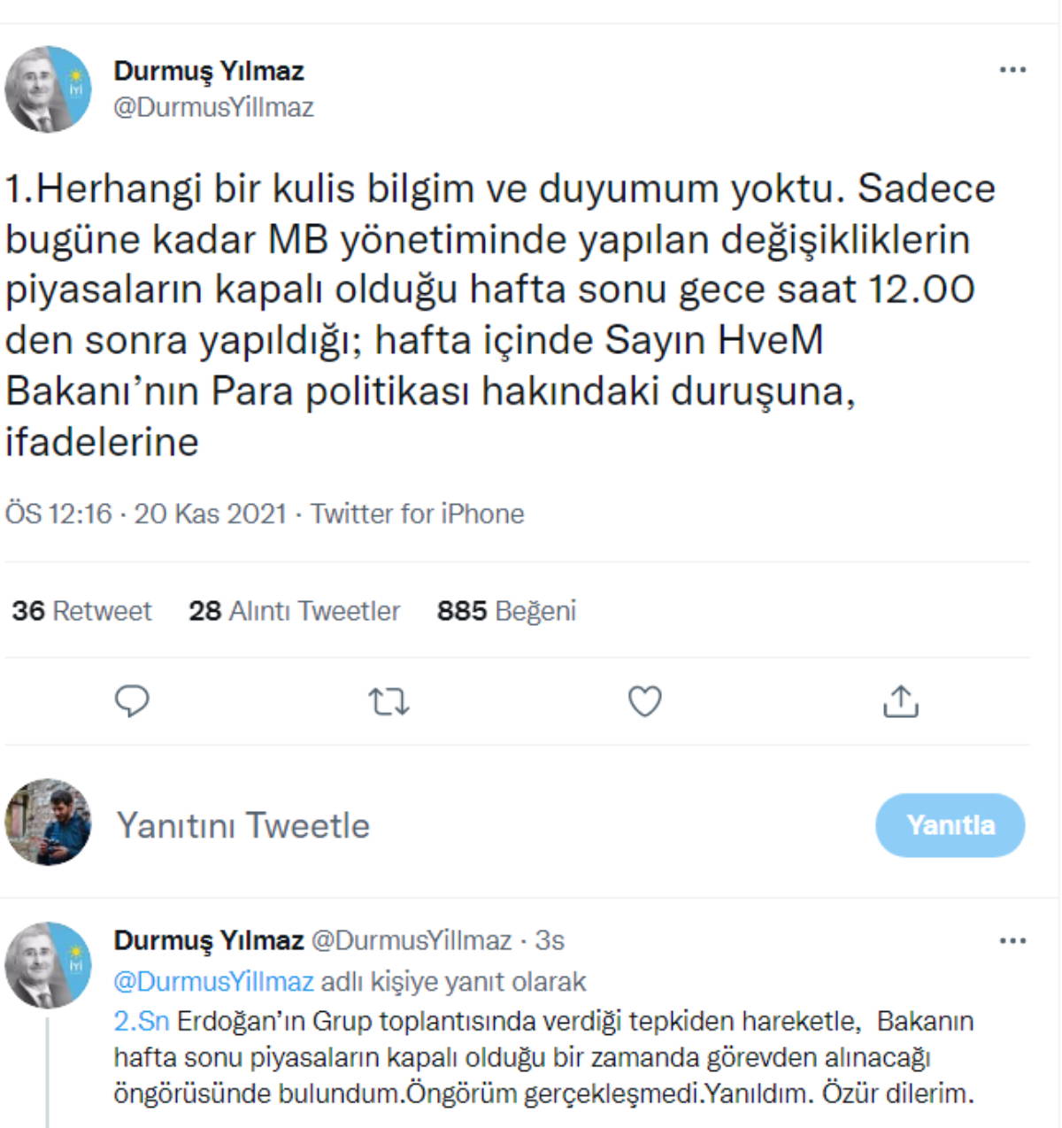 ''Herhangi bir kulis bilgim ve duyumum yoktu. Sadece bugüne kadar Merkez Bankası yönetiminde yapılan değişikliklerin piyasaların kapalı olduğu hafta sonu gece saat 12.00 den sonra yapıldığı; hafta içinde Sayın Hazine ve Maliye Bakanı’nın Para politikası hakındaki duruşuna, ifadelerine Sayın Erdoğan’ın Grup toplantısında verdiği tepkiden hareketle, Bakanın hafta sonu piyasaların kapalı olduğu bir zamanda görevden alınacağı öngörüsünde bulundum. Öngörüm gerçekleşmedi. Yanıldım. Özür dilerim''