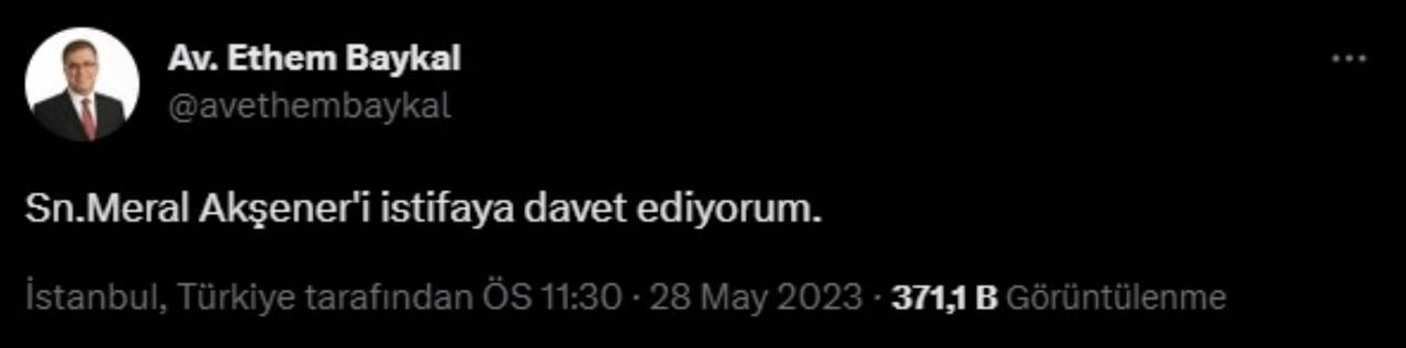 Baykal önce "Bahar gelmeden bitti. Yaz muhalefetle geçer. Winter is coming" paylaşımı yaptı. Ardından da "Sayın Meral Akşener'i istifaya davet ediyorum" dedi.