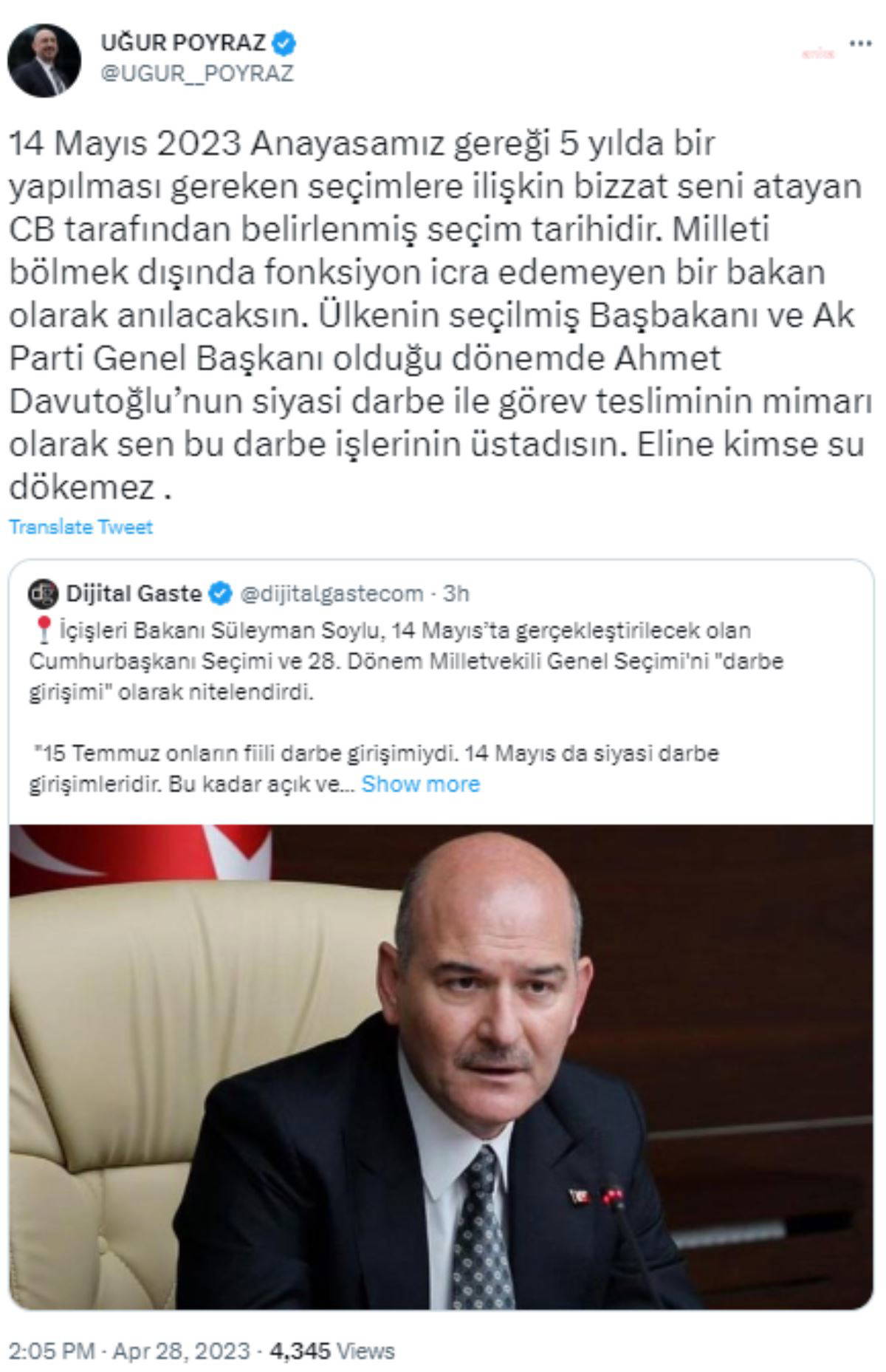 “14 Mayıs 2023 Anayasamız gereği 5 yılda bir yapılması gereken seçimlere ilişkin bizzat seni atayan CB tarafından belirlenmiş seçim tarihidir. Milleti bölmek dışında fonksiyon icra edemeyen bir bakan olarak anılacaksın. Ülkenin seçilmiş Başbakanı ve Ak Parti Genel Başkanı olduğu dönemde Ahmet Davutoğlu’nun siyasi darbe ile görev tesliminin mimarı olarak sen bu darbe işlerinin üstadısın. Eline kimse su dökemez.”