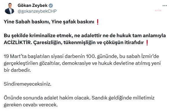 Paylaşımında, "Saray" talimatıyla başlatılan 9 Mart operasyonlarının 100. gününe atıf yapan Zeybek, "19 Mart’ta başlatılan siyasi darbenin 100. gününde, bu sabah İzmir’de gerçekleştirilen gözaltılar, demokrasiye ve hukuk devletine atılmış yeni bir darbedir" dedi.