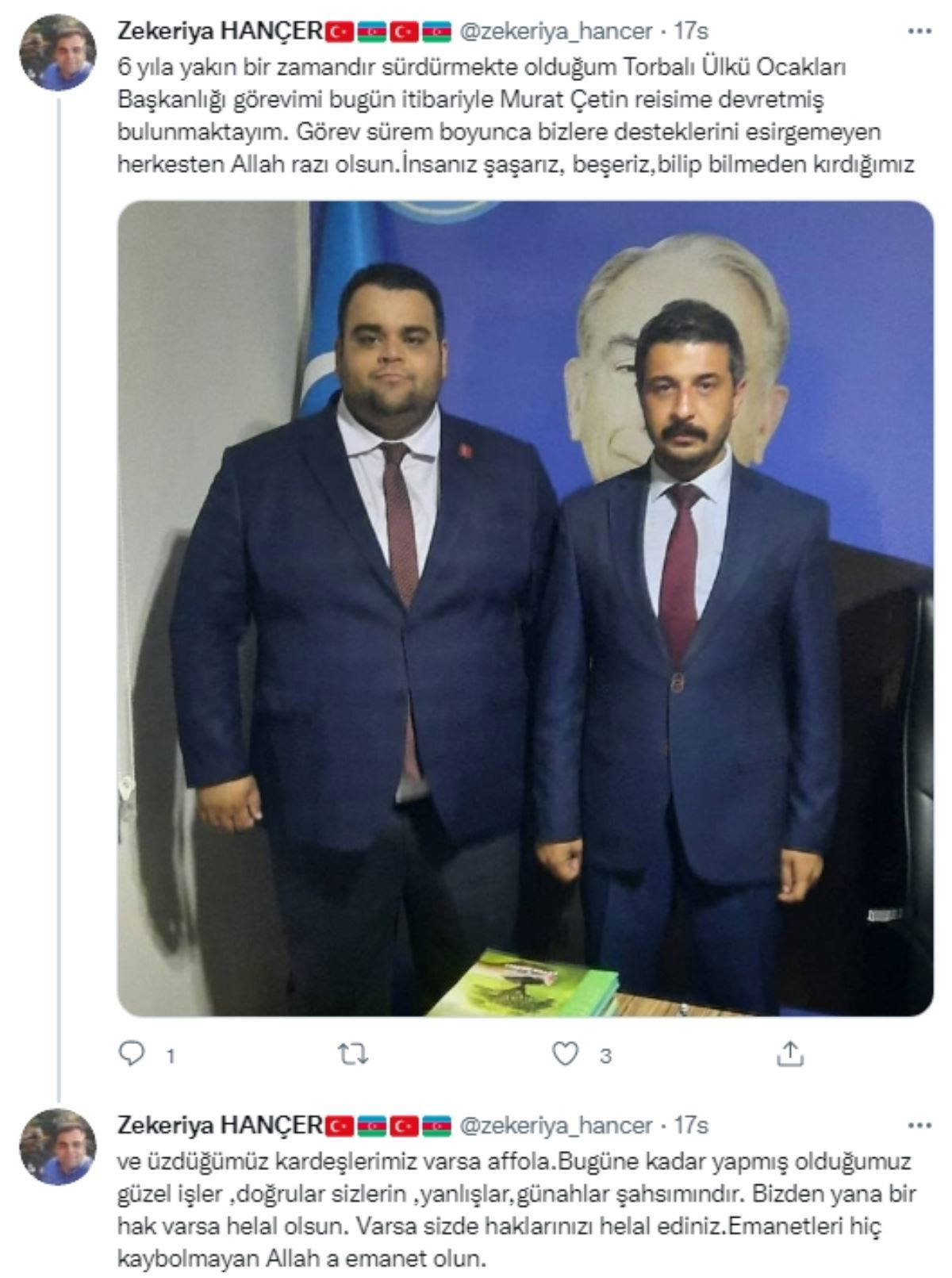 "Torbalı Ülkü Ocakları Başkanlığı görevimi bugün itibariyle Murat Çetin reisime devretmiş bulunmaktayım. Görev sürem boyunca bizlere desteklerini esirgemeyen herkesten Allah razı olsun. İnsanız şaşarız, beşeriz. Bilip bilmeden kırdığımız ve üzdüğümüz kardeşlerimiz varsa affola."