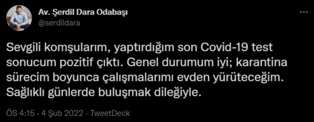Omicron varyantının da etkisiyle Türkiye ve dünyada Covid-19 vaka sayıları hızla yükseliyor. Aralarında ünlü ve siyasi isimlerin de dahil olduğu birçok kişiden 'Covid-19 pozitif' haberleri geliyor. Son olarak bu isimlerden biri de Kadıköy Belediye Başkanı, Avukat Şerdil Dara Odabaşı oldu.