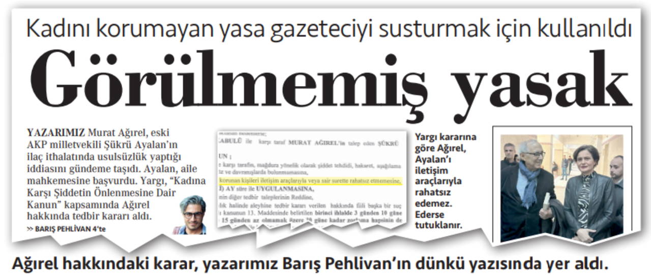 Gazetemizin yazarı Murat Ağırel’in çok tartışılan ilaç sektörü hakkında yaptığı haberin ardından, haberlerinde konu ettiği isimlerden eski AKP’li milletvekili Şükrü Ayalan’ın, Ağırel hakkında 6284 sayılı “ailenin korunması ve kadına karşı şiddetin önlenmesi” kanununa göre tedbir kararı aldırması tartışma konusu oldu.
