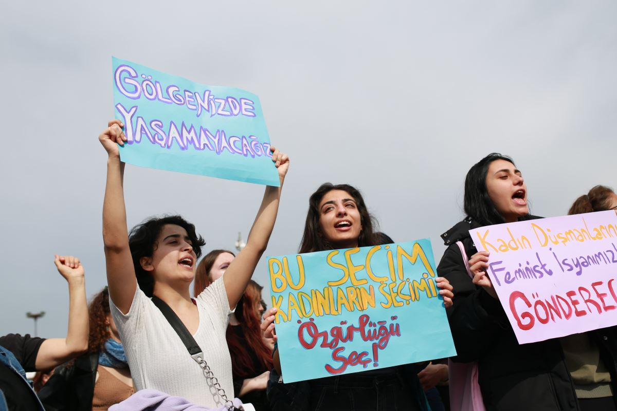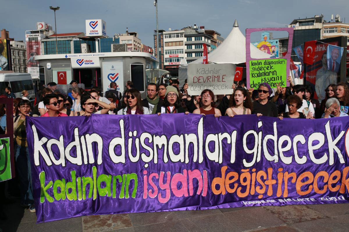 “Bugün hayatlarımız, haklarımız için birbirimizin umudu olduğumuz için buluştuk. Bu siyasi düzene mahkûm olmadığımızı, daha iyisini hak ettiğimizi ve daha iyisini kuracağımızı söylemek için toplandık. Mücadelemizle, isyanımızla, bizden çalmak için 20 yıldır uğraştıkları hayatlarımızı savunmak için bir araya geldik. İsyanımızı büyütmek ve örgütlemek için “İsyan” diyoruz. Erkek şiddetine, trans cinayetlerine, haklarımızı gasp etmeye kalkanlara, emeğimizi sömürüp görünmez kılanlara, savaşa, kayyum siyasetine, homofobiye, transfobiye, tacize, tecavüze, İstanbul Sözleşmesi’ni fes edenlere, kadınlar yoksullaşırken bir de nafakaya göz dikenlere: İsyan!”