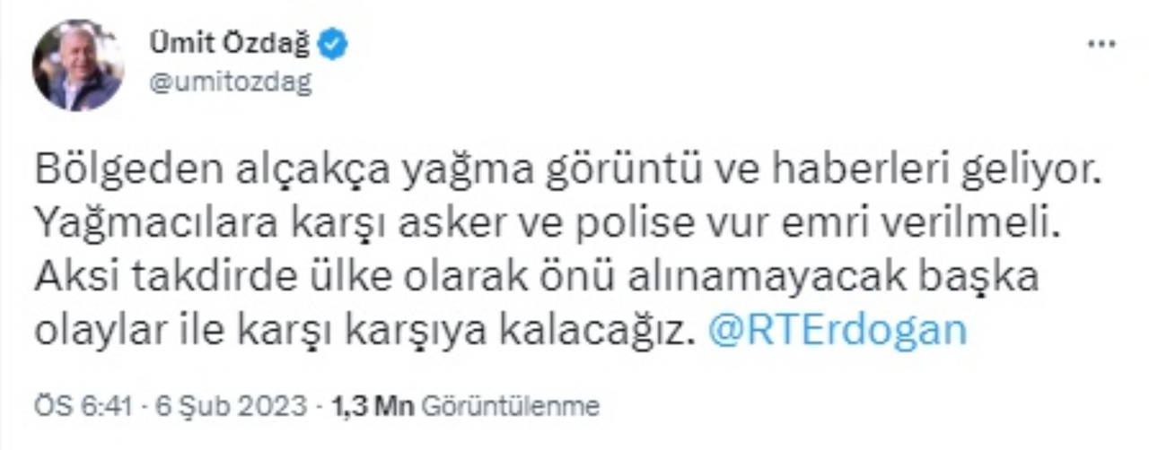 Özdağ, felaket bölgesinde yağma olaylarının yaşandığını öne sürüp askere ve polise vur emri verilmesini istedi.