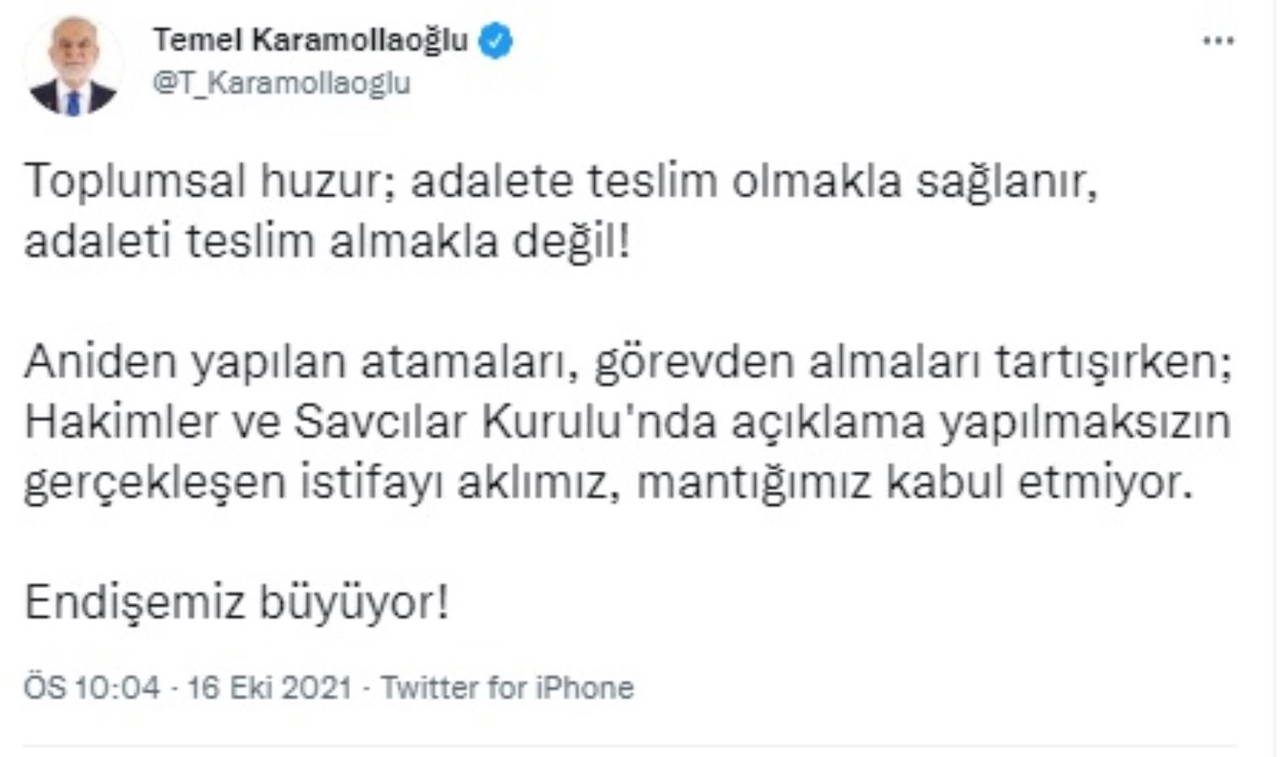 "Toplumsal huzur; adalete teslim olmakla sağlanır, adaleti teslim almakla değil! Aniden yapılan atamaları, görevden almaları tartışırken; Hakimler ve Savcılar Kurulu'nda açıklama yapılmaksızın gerçekleşen istifayı aklımız, mantığımız kabul etmiyor. Endişemiz büyüyor!"