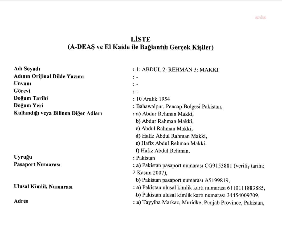 Pakistanlı Abdul Rehman Makki'nin Türkiye'deki mal varlığının dondurulmasını ilişkin karar, Resmi Gazete'de bugün yayınlanarak yürürlüğe girdi.