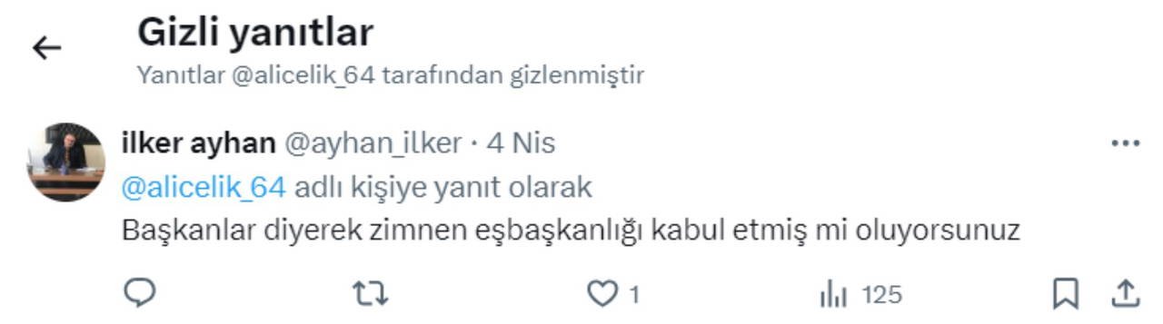 Öte yandan Çelik'e bir kişi tarafından gelen "Başkanlar diyerek zimnen eşbaşkanlığı kabul etmiş mi oluyorsunuz" yanıtını da gizlemiş olduğu görüldü.