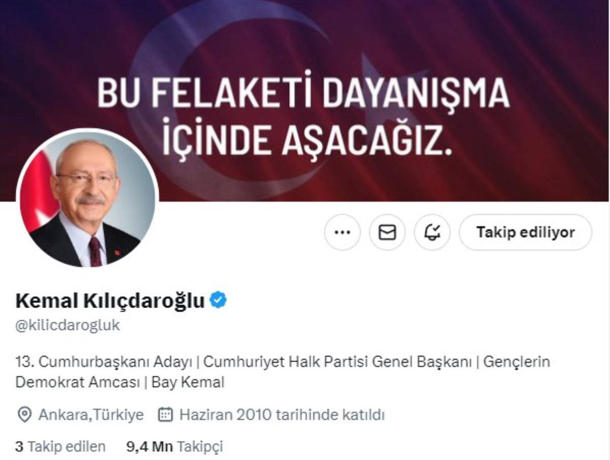 Kılıçdaroğlu, profilinde yer alan “Cumhuriyet Halk Partisi Genel Başkanı, Gençlerin Demokrat Amcası, Bay Kemal” sıfatlarının başına, “13. cumhurbaşkanı adayı” ibaresini de ekledi.