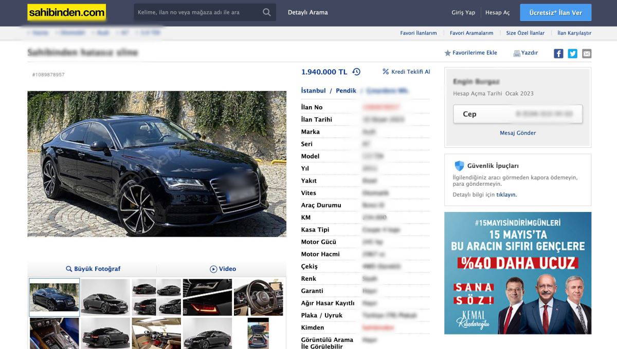 Cumhuriyet Halk Partisi (CHP) Genel Başkanı ve Millet İttifakı'nın cumhurbaşkanı adayı Kemal Kılıçdaroğlu, sahibinden.com'da araç ilanlarına reklam verdi.