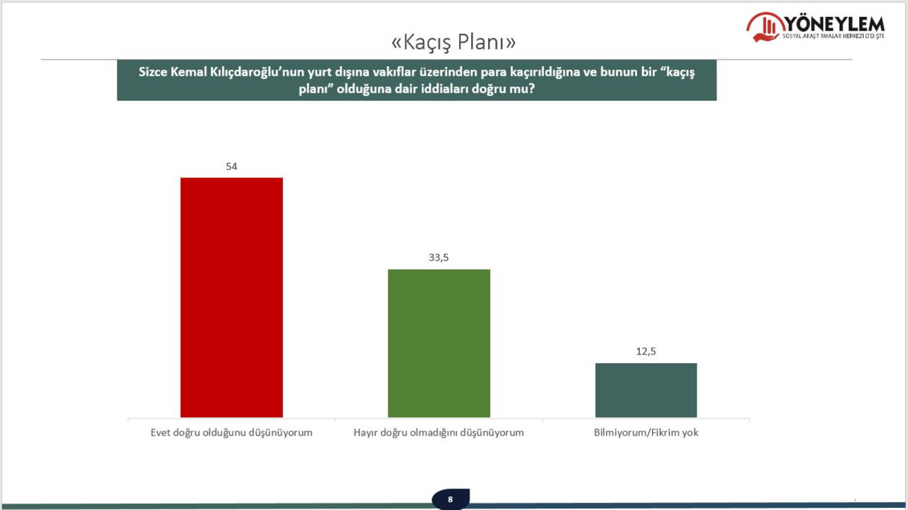 Yöneylem Araştırma tarafından paylaşılan ankette yurttaşlara, "Sizce Kemal Kılıçdaroğlu'nun yurtdışına vakıflar üzerinden para kaçırıldığını ve bunun bir 'kaçış planı' olduğuna dair iddiaları doğru mu?" sorusu yöneltildi.