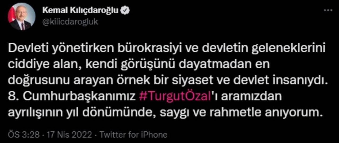 Cumhuriyet Halk Partisi (CHP) Genel Başkanı Kılıçdaroğlu da, 8. Cumhurbaşkanı Turgut Özal’ın ölüm yıl dönümüne ilişkin bir anma mesajı paylaştı. CHP lideri, Twitter'dan yayımladığı mesajında "Kendi görüşünü dayatmadan en doğrusunu arayan örnek bir siyaset ve devlet insanıydı" ifadelerini kullandı.