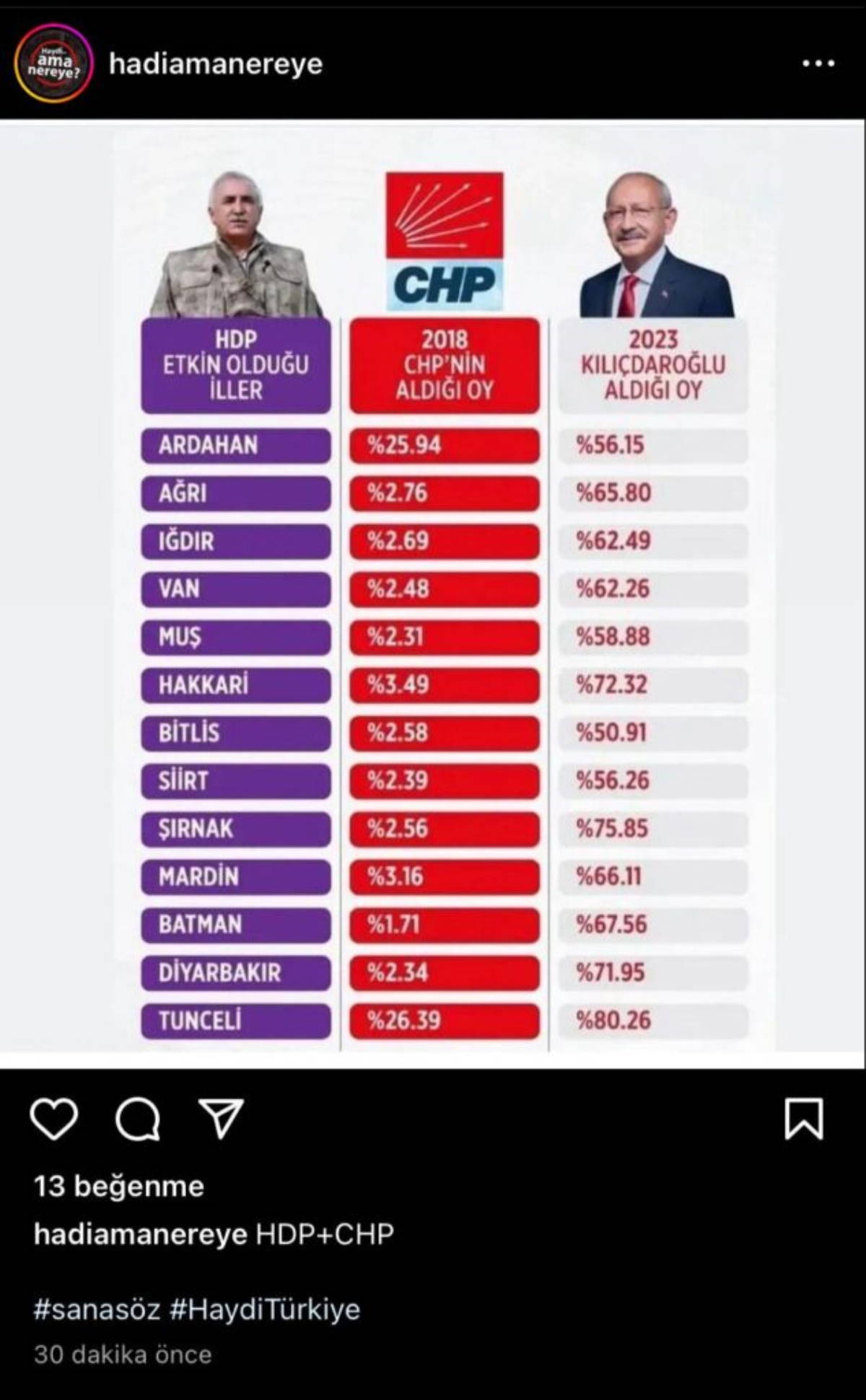 Sayfa ile bağlantılı Instagram hesabında ise Kılıçdaroğlu’nun yüksek oy aldığı Ardahan, Ağrı, Diyarbakır, Mardin, Batman gibi iller sıralanarak bu illerin üzerine Karayılan’ın fotoğrafı yerleştirilen paylaşımlar bulunuyor.