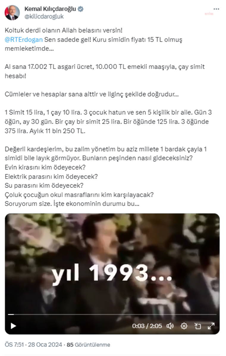 CHP 7. Genel Başkanı Kılıçdaroğlu, AKP Genel Başkanı Recep Tayyip Erdoğan’ın 1993'te henüz belediye başkanı değilken dönemin iktidarını eleştirmek için asgari ücret üzerinden yaptığı çay-simit hesabının videosunu bu akşam X hesabından yayınladı.