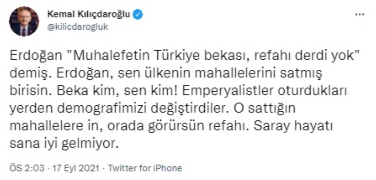Sosyal medya hesabı üzerinden yaptığı açıklamada, Erdoğan'ın "Muhalefetin Türkiye bekası, refahı derdi yok" dediğini dile getiren Kılıçdaroğlu, AKP'li Cumhurbaşkanına şöyle seslendi: