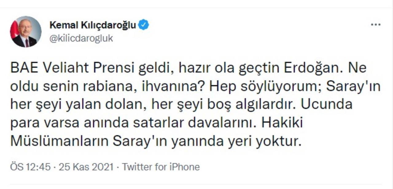 Kılıçdaroğlu, yaptığı paylaşımda, "BAE Veliaht Prensi geldi, hazır ola geçtin Erdoğan. Ne oldu senin rabiana, ihvanına? Hep söylüyorum; Saray'ın her şeyi yalan dolan, her şeyi boş algılardır. Ucunda para varsa anında satarlar davalarını. Hakiki Müslümanların Saray'ın yanında yeri yoktur" ifadelerine yer verdi.