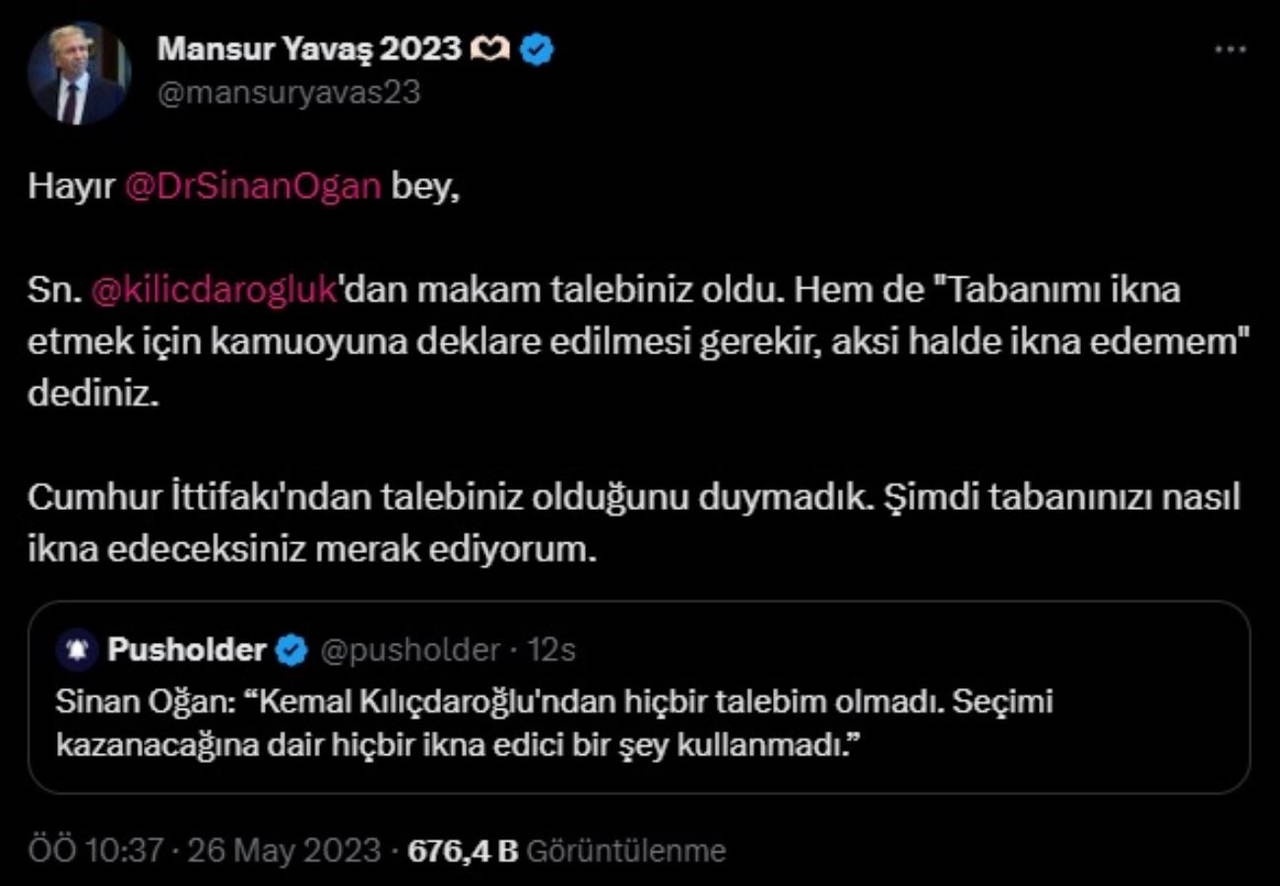 Son olarak Ankara Büyükşehir Beldiye (ABB) Başkanı Mansur Yavaş'ın seçim çalışmalarının aktarıldığı resmi hesaptan yapılan paylaşımda, 2. turda Erdoğan'ı destekleyen Sinan Oğan'ın, Millet İttifakı'nın cumhurbaşkanı adayı Kemal Kılıçdaroğlu'ndan makam talep ettiği belirtildi.