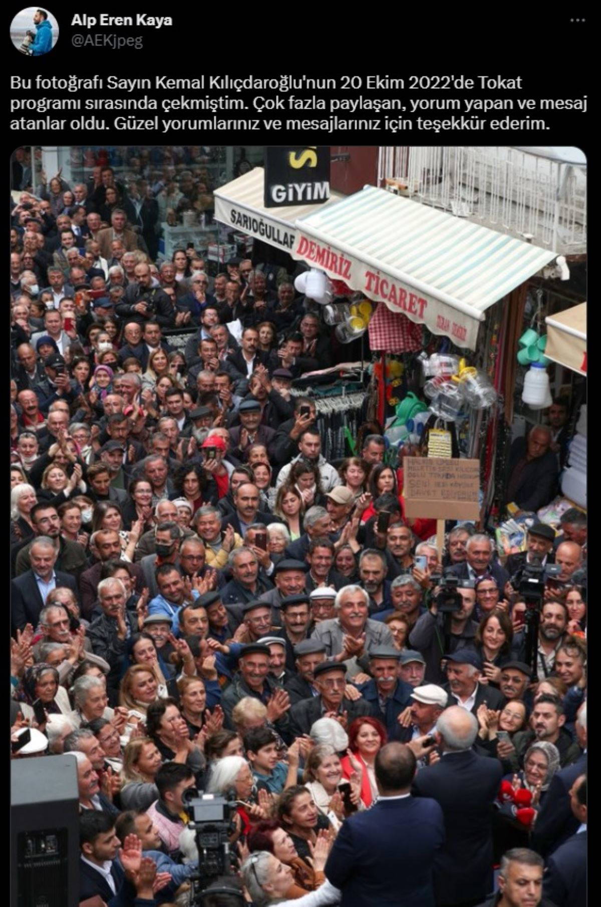 Fotoğrafın Twitter'da gündem olmasının ardından bir açıklama yapan Kaya, "Bu fotoğrafı Sayın Kemal Kılıçdaroğlu'nun 20 Ekim 2022'de Tokat programı sırasında çekmiştim. Çok fazla paylaşan, yorum yapan ve mesaj atanlar oldu. Güzel yorumlarınız ve mesajlarınız için teşekkür ederim" sözlerini kullandı.