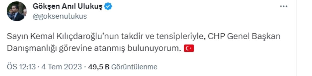 Gökşen Anıl Ulukuş, sosyal medya hesabından yaptığı açıklamada, "Sayın Kemal Kılıçdaroğlu’nun takdir ve tensipleriyle, CHP Genel Başkan Danışmanlığı görevine atanmış bulunuyorum" ifadelerini kullandı.