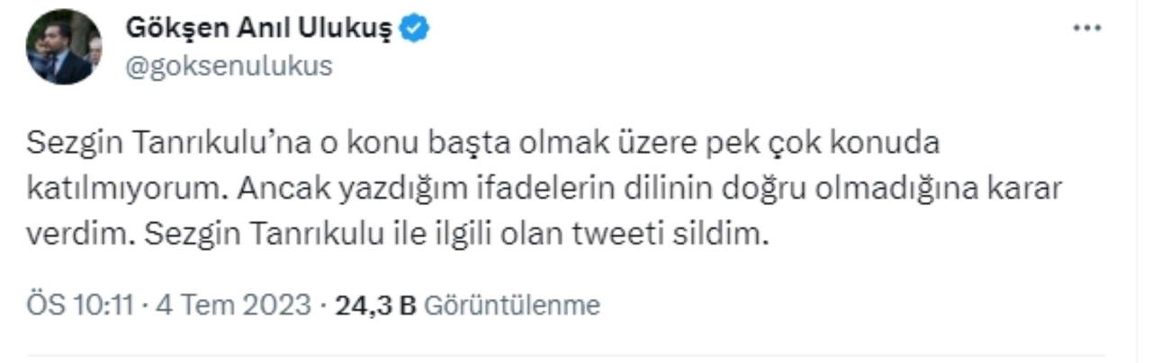 Gökşen Anıl Ulukuş, “Sezgin Tanrıkulu’na o konu başta olmak üzere pek çok konuda katılmıyorum. Ancak yazdığım ifadelerin dilinin doğru olmadığına karar verdim. Sezgin Tanrıkulu ile ilgili olan tweeti sildim” ifadelerine yer vererek söz konusu paylaşımını sildiğini duyurdu.