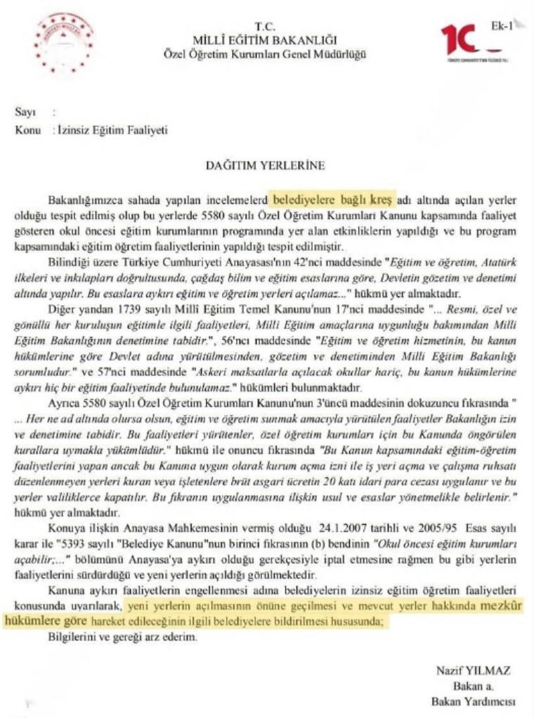 Milli Eğitim Bakanlığı, belediyelere ait "kreş adı altında" açılan kurumların “anaokulu veya anasınıfı gibi faaliyet gösteremeyeceğini” belirterek kapatılmaları ve yenilerinin açılmasına izin verilmemesi doğrultusunda valiliklere bir yazı göndermişti.