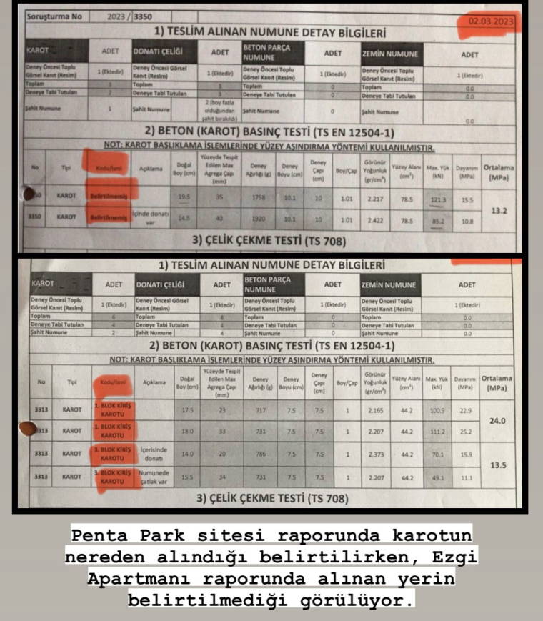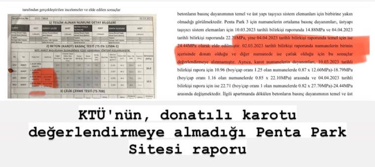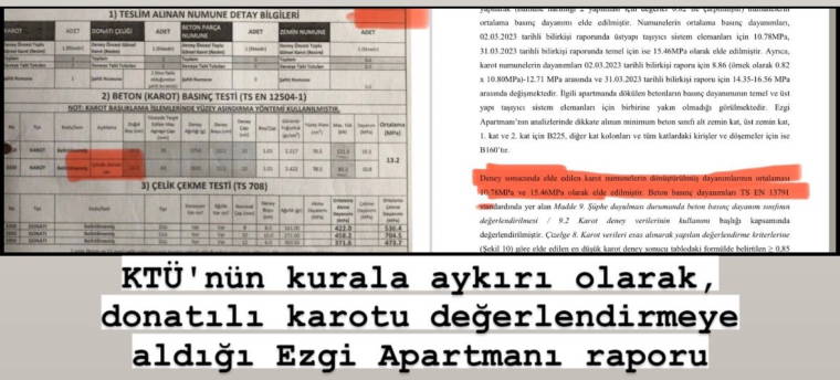 Alınan karot örneğinde donatı(demir) bulunması durumunda, bu örnek üzerinden basınç dayanım testi yapılamayacağı TSE tarafından belirtilmiştir. Çünkü demir içeriği, alınan örneğin dayanıklılığını zayıflatır. KTÜ, Ezgi Apartmanına yalnızca 200 metre uzaklıktaki Penta Park Sitesi için rapor hazırlarken bu kuralı dikkate almış ve içinde donatı(demir) olan karot örneklerini değerlendirme dışı bırakmıştır. Ancak aynı KTÜ, Ezgi Apartmanı’nda içinde donatı bulunan karot örneklerini, bu kuralı hiçe sayarak değerlendirmeye almıştır. Bu nedenle beton basınç dayanımı, DSİ raporunda 18.8 MPA çıkmış, ancak KTÜ’nün baz aldığı raporda 13.2 MPA çıkmıştır. Öte yandan Penta Park’ın raporunda karotun nereden alındığı kural gereği belirtilirken, Ezgi Apartmanı’nda karotun nereden alındığı da belirtilmemiştir. Bir kurum, aynı durumda iki farklı raporu nasıl verebiliyor? Bu çifte standart hakkında da görevi kötüye kullanmadan dava açacağız. Müvekkilimin masumiyetinin belgelerle kanıtlandığı yerde mağduriyetinin giderilmesini ve tahliye edilmesini talep ediyoruz.”