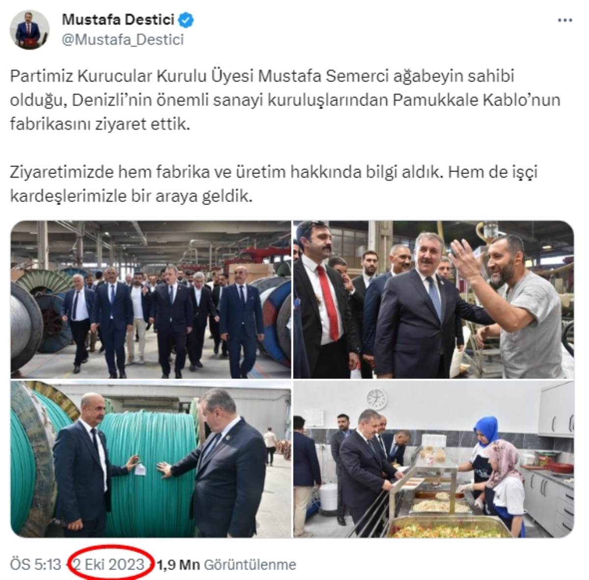 Destici paylaşımında, “Partimiz Kurucular Kurulu Üyesi Mustafa Semerci ağabeyin sahibi olduğu, Denizli’nin önemli sanayi kuruluşlarından Pamukkale Kablo’nun fabrikasını ziyaret ettik” ifadelerini kullanmış.