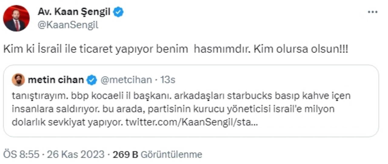 İddia üzerine BBP'den de kısa bir "tepki" geldi. BBP Kocaeli İl Başkanı Kaan Şengil, Metin Cihan’ın paylaşımını alıntılayarak, “Kim ki İsrail ile ticaret yapıyor benim hasmımdır. Kim olursa olsun!!!” dedi.