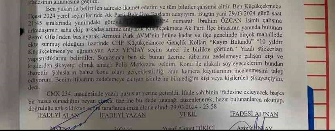 CHP Küçükçekmece Gençlik Kolları'nın hazırladığı afişte Aziz Yeniayı'ın fotoğrafı ve 'Kayıp bulundu. 10 yıldır Küçükçekmece'ye uğramayan Aziz Yeniay seçim süreci ile birlikte görüldü' ifadesi yer aldı. Gençlere 'hakaret' suçundan işlem yapıldı.