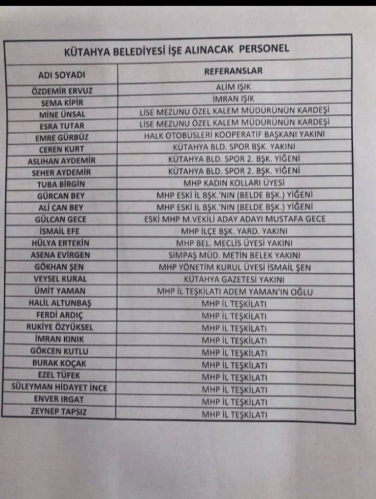 MHP’li Kütahya Belediyesi’nde işe alınacak personeller için bir liste hazırlandı. Söz konusu listede işe alınacak isimlerin karşısında “referans” olarak MHP’li yöneticilerin isimlerinin yer alması işe alımlarda “torpil” uygulandığı iddiasını akıllara getirdi.