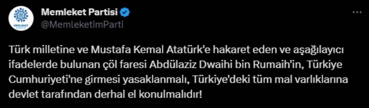 Partiden yapılan açıklamada, "Türk milletine ve Mustafa Kemal Atatürk'e hakaret eden ve aşağılayıcı ifadelerde bulunan çöl faresi Abdülaziz Dwaihi bin Rumaih'in, Türkiye Cumhuriyeti'ne girmesi yasaklanmalı, Türkiye'deki tüm mal varlıklarına devlet tarafından derhal el konulmalıdır!" ifadelerine yer verildi.
