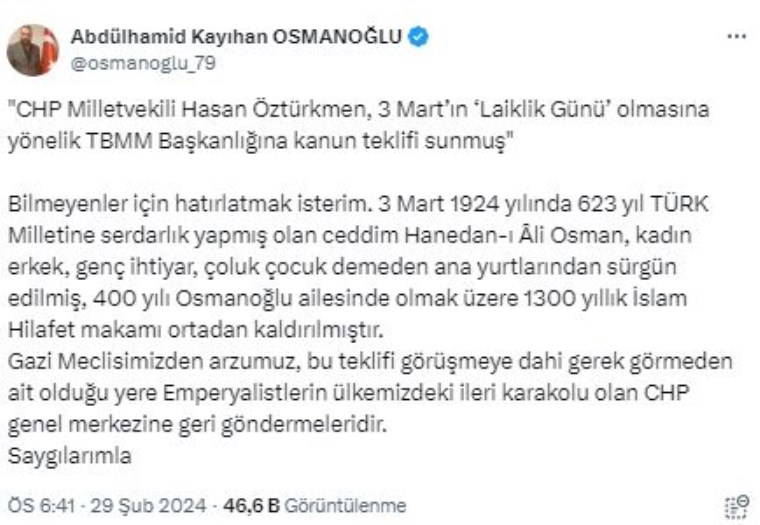 3 Mart Devrim Yasaları’nın kabul edildiği günün ‘Laiklik Günü’ olarak ilan edilmesine yönelik TBMM Başkanlığına kanun teklifi sunulması, Osmanlı Devleti'nin padişahlarından Sultan 2. Abdulhamid'in torunu Kayıhan Osmanoğlu'nu kızdırdı.