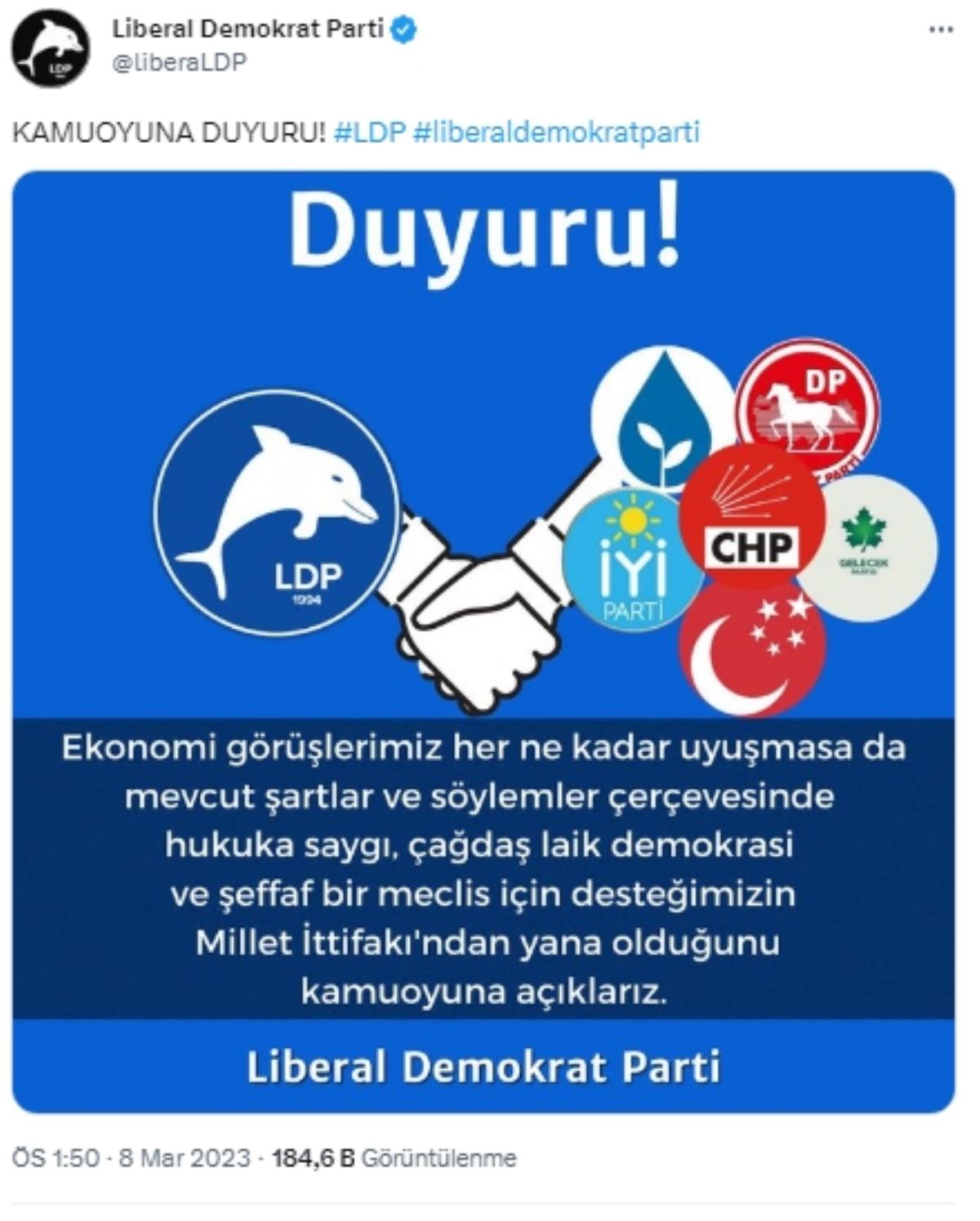 Liberal Demokrat Parti'nin açıklamasında partinin Millet İttifakı bileşenlerini destekleyeceği belirtildi.