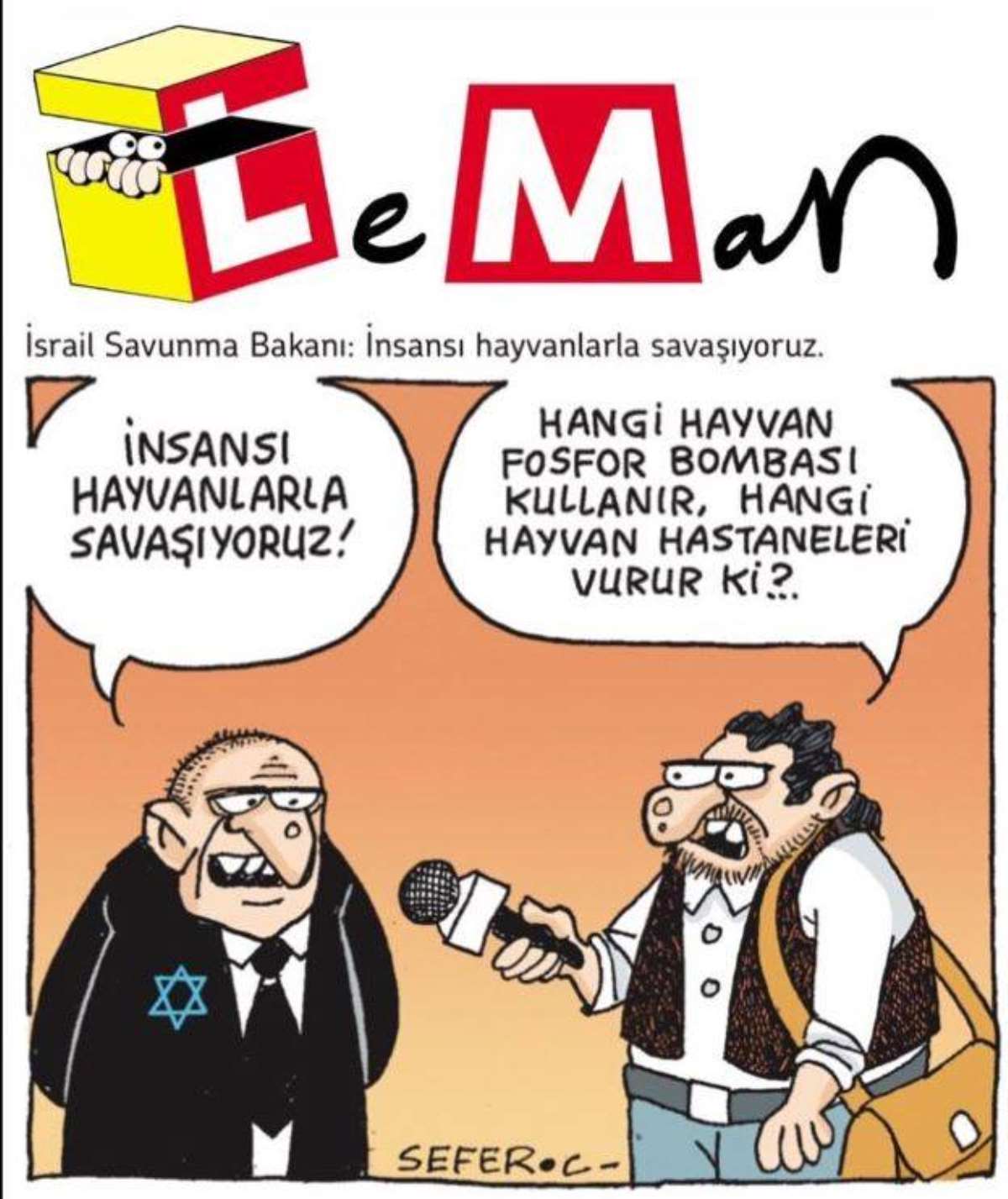 Haftalık karikatür ve mizah dergisi LeMan bu hafta kapağına İsrail’i taşıdı. Bir gazetecinin sorularına cevap veren İsraillinin konulduğu kapakta İsrailli “İnsansı hayvanlarla savaşıyoruz” dediği, gazetecinin ise İsrail’e gönderme yaparak “Hangi hayvan fosfor bombası kullanır, hangi hayvan hastaneleri vurur ki” diye sorduğu görüldü.