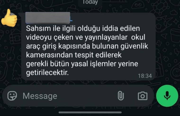 “Şahsım ile ilgili olduğu iddia edilen videoyu çeken ve yayınlayanlar okul araç giriş kapısında bulunan güvenlik kamerasından tespit edilerek gerekli bütün yasal işlemler yerine getirilecektir.”