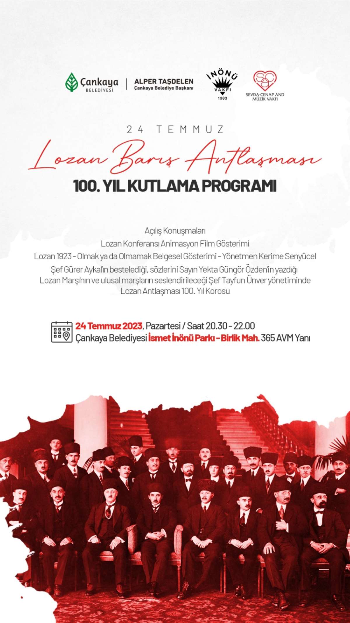 Çankaya Belediyesi, İnönü Vakfı ve Sevda Cenap And Vakfı işbirliği ile İsmet İnönü Parkı’nda saat 20.30’da, “Lozan Barış Antlaşması 100. Yıl Kutlama Programı” düzenlenecek. Şef Tayfun Ünver yönetiminde koro konseri ile program sona erecek.