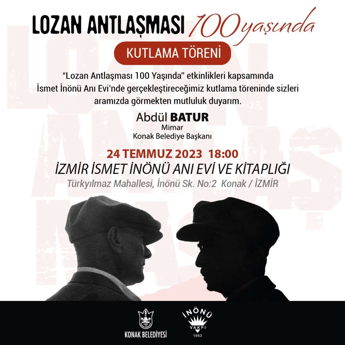 İzmir’de ise Lozan’ın 100’üncü yıldönümü bir hafta süren etkinliklerle kutlanacak. Önceki gün gençlik kampıyla başlayan etkinlikler, bugün Vasıf Çınar Bulvarı’nda “100. Yılında Lozan ve Tarihi Süreçteki Yeri” sergisiyle sürecek. 30 Ağustos’a kadar açık kalacak 40 panoluk sergi, bağımsızlık coşkusunu sokağa taşıyacak. Ayrıca, bugün Kültür Park’ın Lozan girişindeki Atatürk-İsmet İnönü heykelinin önüne çelenk koyulacak. Ardından “Lozan Antlaşması Yeni Yüzyılına Girerken” başlıklı panel için İzmir Büyükşehir Belediyesi Şehir Tiyatroları İsmet İnönü Sahnesi’ne geçilecek.
