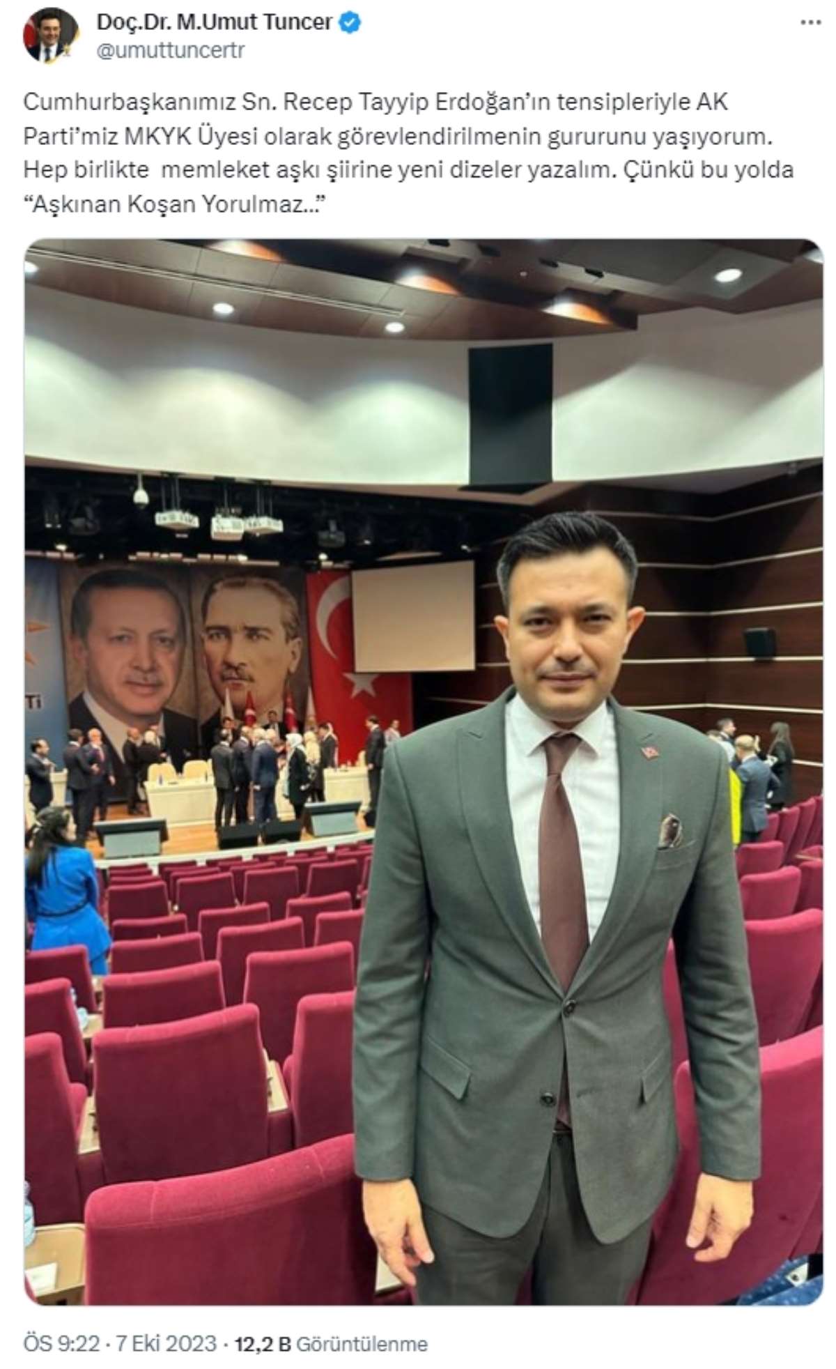 "Cumhurbaşkanımız Sn. Recep Tayyip Erdoğan’ın tensipleriyle AK Parti’miz MKYK Üyesi olarak görevlendirilmenin gururunu yaşıyorum. Hep birlikte memleket aşkı şiirine yeni dizeler yazalım. Çünkü bu yolda “Aşkınan Koşan Yorulmaz…”
