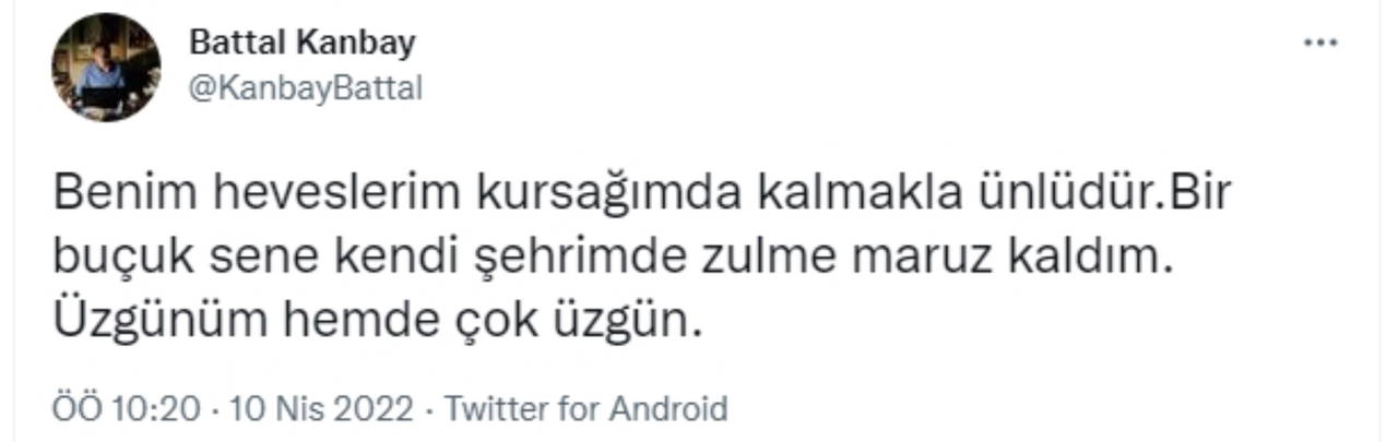 Kanbay'ın kararla birlikte Twitter hesabından yaptığı paylaşım da dikkat çekti. Kanbay, "Benim heveslerim kursağımda kalmakla ünlüdür. Bir buçuk sene kendi şehrimde zulme maruz kaldım. Üzgünüm hem de çok üzgün" ifadelerini kullandı.