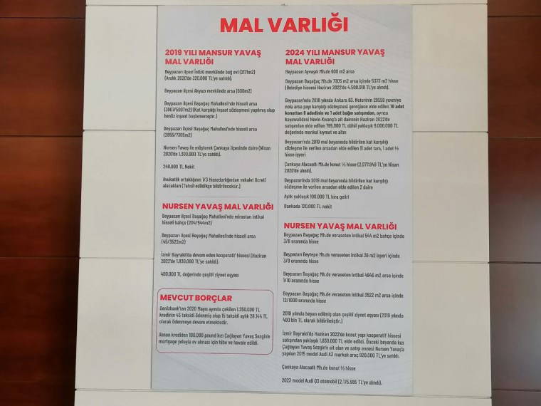 İlanda, "2019 yılı Mansur Yavaş malvarlığı ile 2024 yılı Mansur Yavaş mal varlığı" ile "Nursen Yavaş malvarlığı" başlıkları altında varlık kalemleri yer aldı.