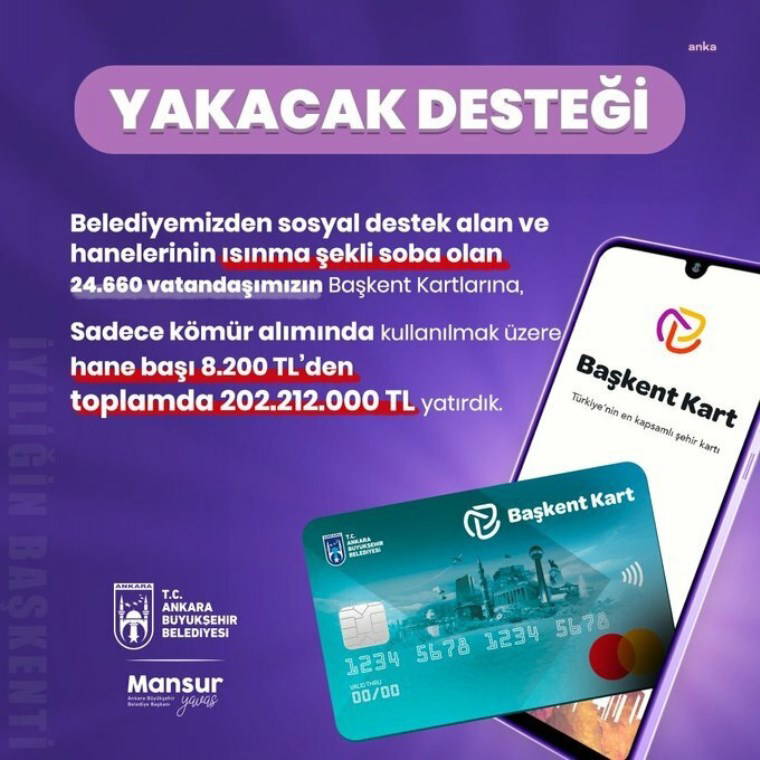 “Ankara’da kimse yalnız değil, bu kış da kimse üşümeyecek! Sosyal destek alan ve sobayla ısınan 24.660 ailemizin Başkent Kartlarına hane başı 8.200 TL yakacak desteği sağladık. Toplamda 202.212.000 TL dayanışma desteği ile iyiliğin ve yardımlaşmanın başkenti olmaya devam ediyoruz.”