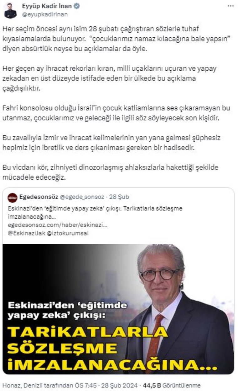 AKP Gençlik Kolları Başkanı ve İzmir Milletvekili Eyüp Kadir İnan, konuyla ilgili sosyal medya hesabı üzerinden yaptığı açıklamada Eskinazi'yi ağır ifadelerle hedef aldı.