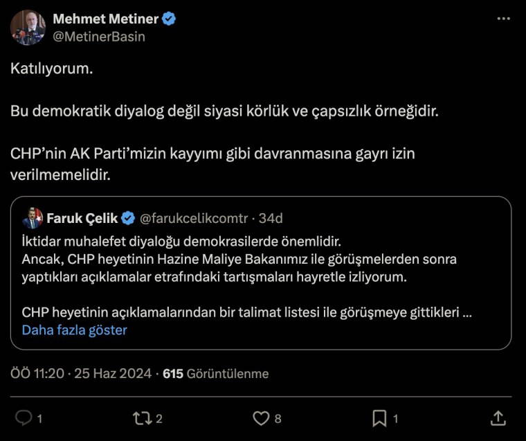 X hesabında Faruk Çelik'in paylaşımını alıntılayan Metiner, "Katılıyorum. Bu demokratik diyalog değil siyasi körlük ve çapsızlık örneğidir. CHP’nin AK Parti’mizin kayyımı gibi davranmasına gayrı izin verilmemelidir" ifadelerini kullandı.