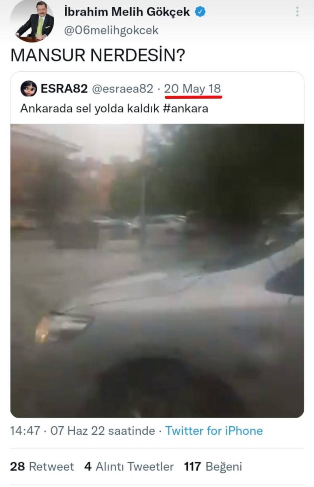 Twitter'ı aktif kullanan isimlerden olan eski Ankara Büyükşehir Belediye Başkanı Melik Gökçek, sosyal medyada yine alay konusu oldu. 4 yıl önceki sel görüntülerinden Ankara Büyükşehir Belediye Başkanı Mansur Yavaş'ı sorumlu tutan Gökçek, videonun tarihinin eski olduğunu görünce, tweetini apar topar sildi.